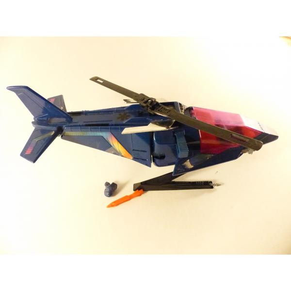 Avion et personnage complets, le cockpit de Switchblade fonctionne correctement mais fissuré sur un côté. 1 mécanisme d'aile un peu capricieux à refermer. 1 autocollant légèrement abîmé.