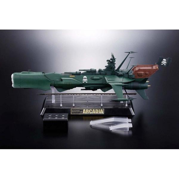 Superbe reproduction fidèle du vaisseau Arcadia d'Albator produite par Bandai et mesurant 47 cm de long environ Cette réplique avec parties métalliques possède des fonctionnalités sonores et lumineuses le tout dans un packaging de grande classe!