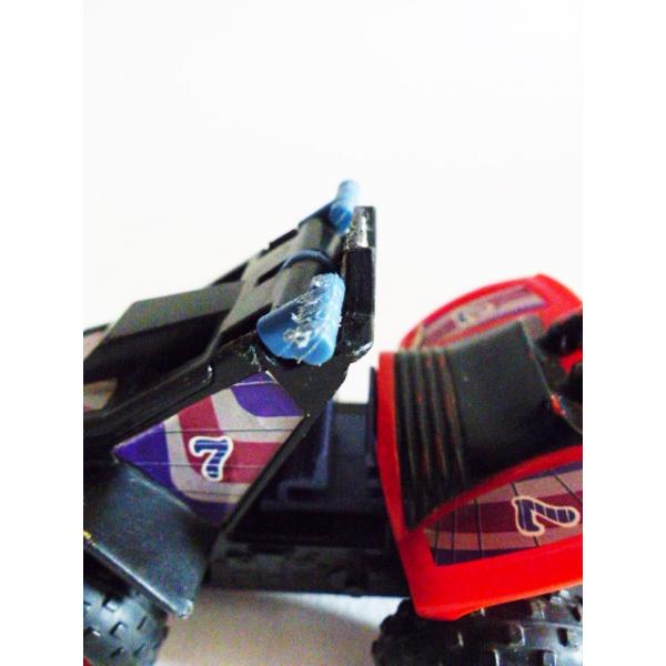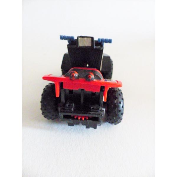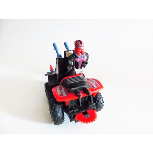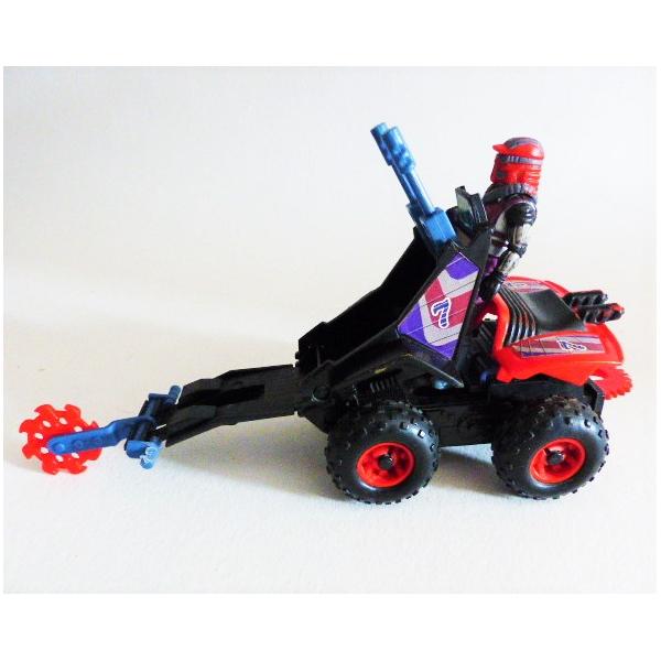 The quad is in very good condition. All the transformation mechanisms are operational! A handle is shredded at the end. The 2 Miles Mayhem characters are complete.
