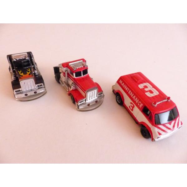 La marque Tyco distribue des circuits électriques reprenant des options comme les rails fluorescents qui permettent de jouer dans le noir. Le circuit semble complet et les voitures sont en parfait état.