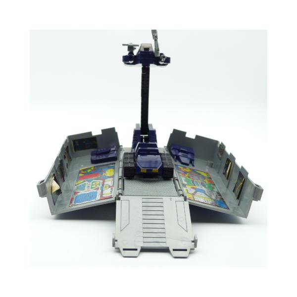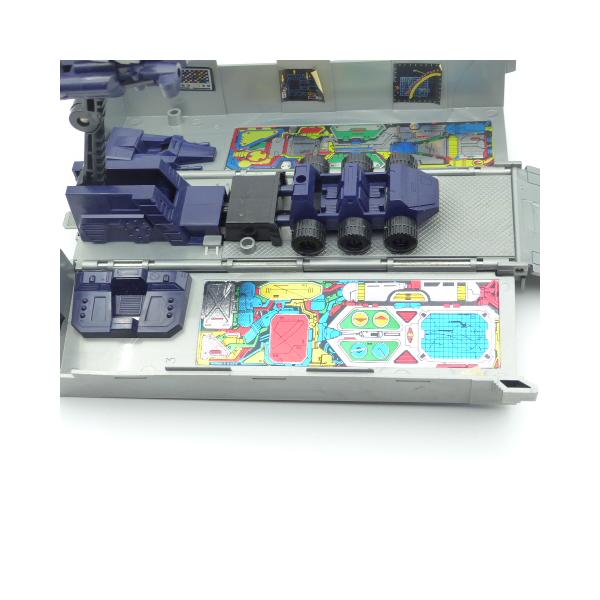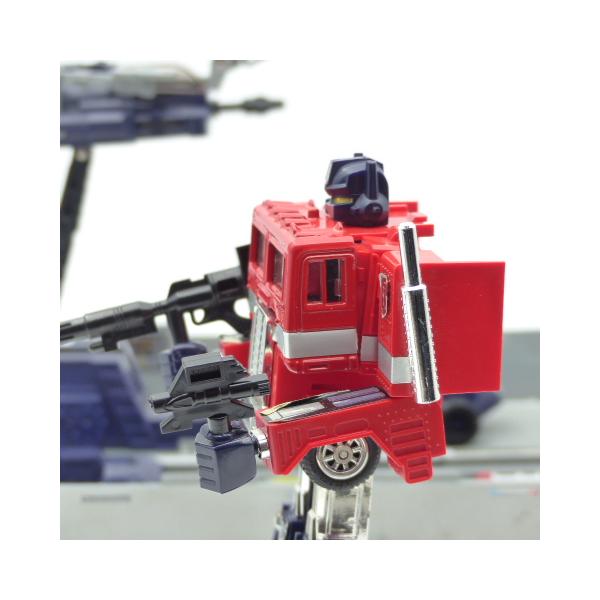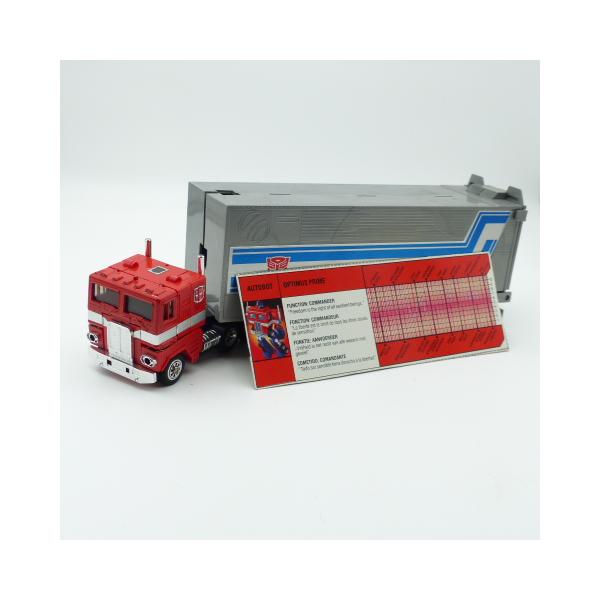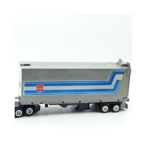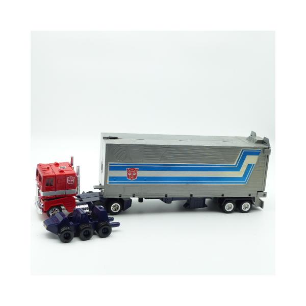Autobot figure of the famous leader of the good people Optimus prime! Find this vintage collector's toy from the 80s in full articulated metal with its removable fists and weapons. The plastic trailer is in great condition with its vehicle inside, only a small accessory barrel is missing.