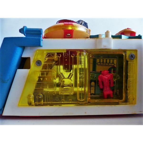 Mixing plastic and metal, this toy has 2 compartments on each side to store the accessories provided, namely here missiles, the mini saucer and its robot. In excellent condition, do not miss this jewel!