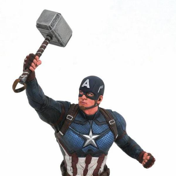 Ici, nous retrouvons Captain America, le premier super héro de l'histoire des Avengers, en pleine action, brandissant le marteau de Thor. Cette Statuette est issu du film AVENGERS EndGame et reprend les traits de Steve Rogers incarné par l'acteur Chris Evans.