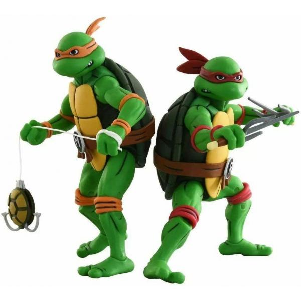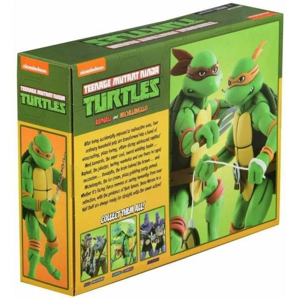 les figurines de ce coffret, Raphael & Michelangelo, mesurent 14 cm. Elles sont vendues avec armes, paire de main supplémentaire et accessoires tels que la pizza en boîte, nunchakus...