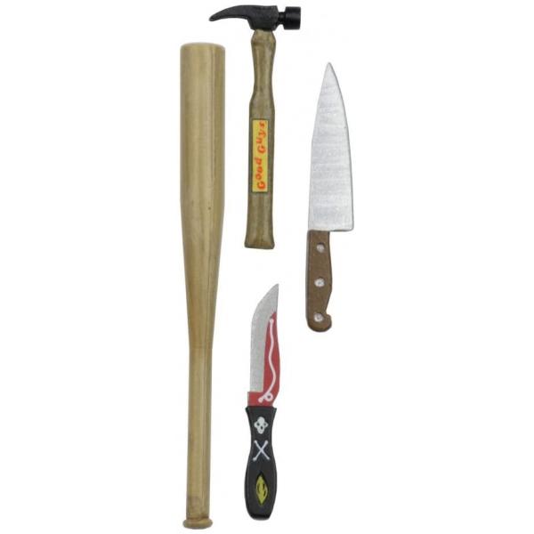 Accessoire unique de cette ligne, vous trouverez 2 couteaux, une batte et un marteau. Les vêtements de Chucky sont en tissu
