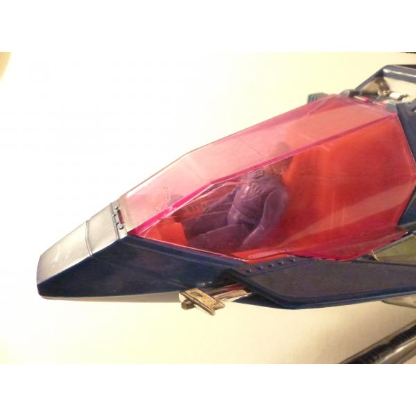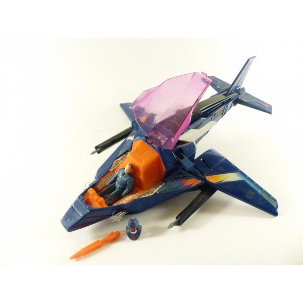 Avion et personnage complets, le cockpit de Switchblade fonctionne correctement mais fissuré sur un côté. 1 mécanisme d'aile un peu capricieux à refermer. 1 autocollant légèrement abîmé.