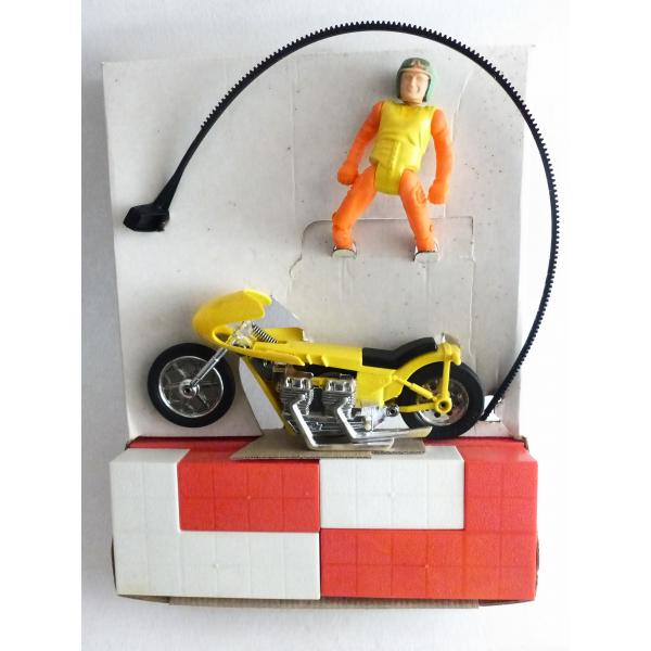 La boîte du jeu Gyro jet les motards reste dans un bon état,sans manque. Elle se compose d'une moto complète avec son pilote.