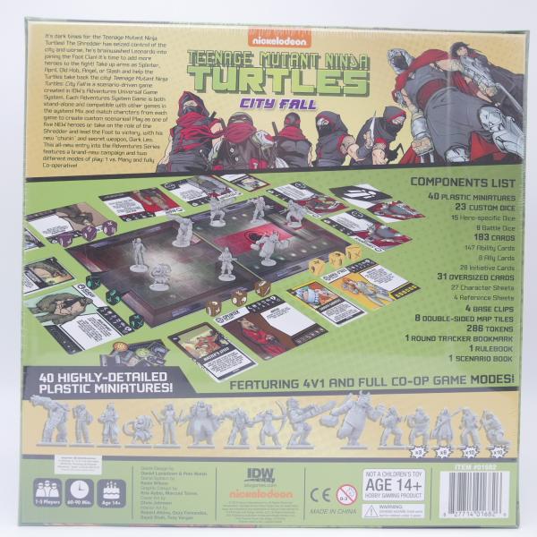City Fall est le deuxième volume de la série de jeux de figurines de la série "Adventures" d'IDW. Ce jeu et le volume un (Change Is Constant) sont tous deux des jeux autonomes, tout en étant compatibles entre eux. Change Is Constant suit les deux premières histoires de la série TMNT d'IDW, tandis que City Fall se concentre sur l'histoire du recrutement inattendu d'une tortue dans le Foot Clan.
